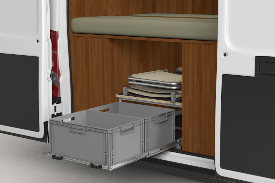 Heckauszug Camper / Kastenwagen – Schwerlastauszug mit Ablageoption